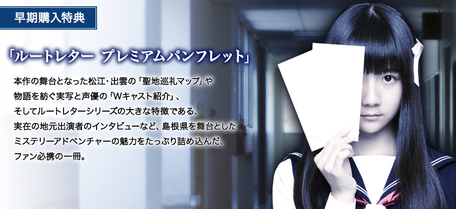 企画/キャラクターデザイナーの箕星太朗氏の描き下ろした美少女が表紙を飾る全56ページの豪華なアートブック。キャラクター原画や、背景美術、そして初公開となる設定資料など、『ルートレター』の魅力を存分に堪能できる一冊です。